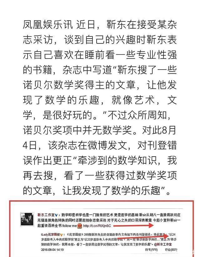 可靳东本人,从未参与对话。 甚至可能至今蒙在鼓里。 这场风波里,他像极了被流弹击中的旁观者。 更讽刺的是,靳东的“文化人设”争议,早已是粉丝澄清过无数次的旧账。 “诺贝尔数学奖”,原是早年杂志笔误。